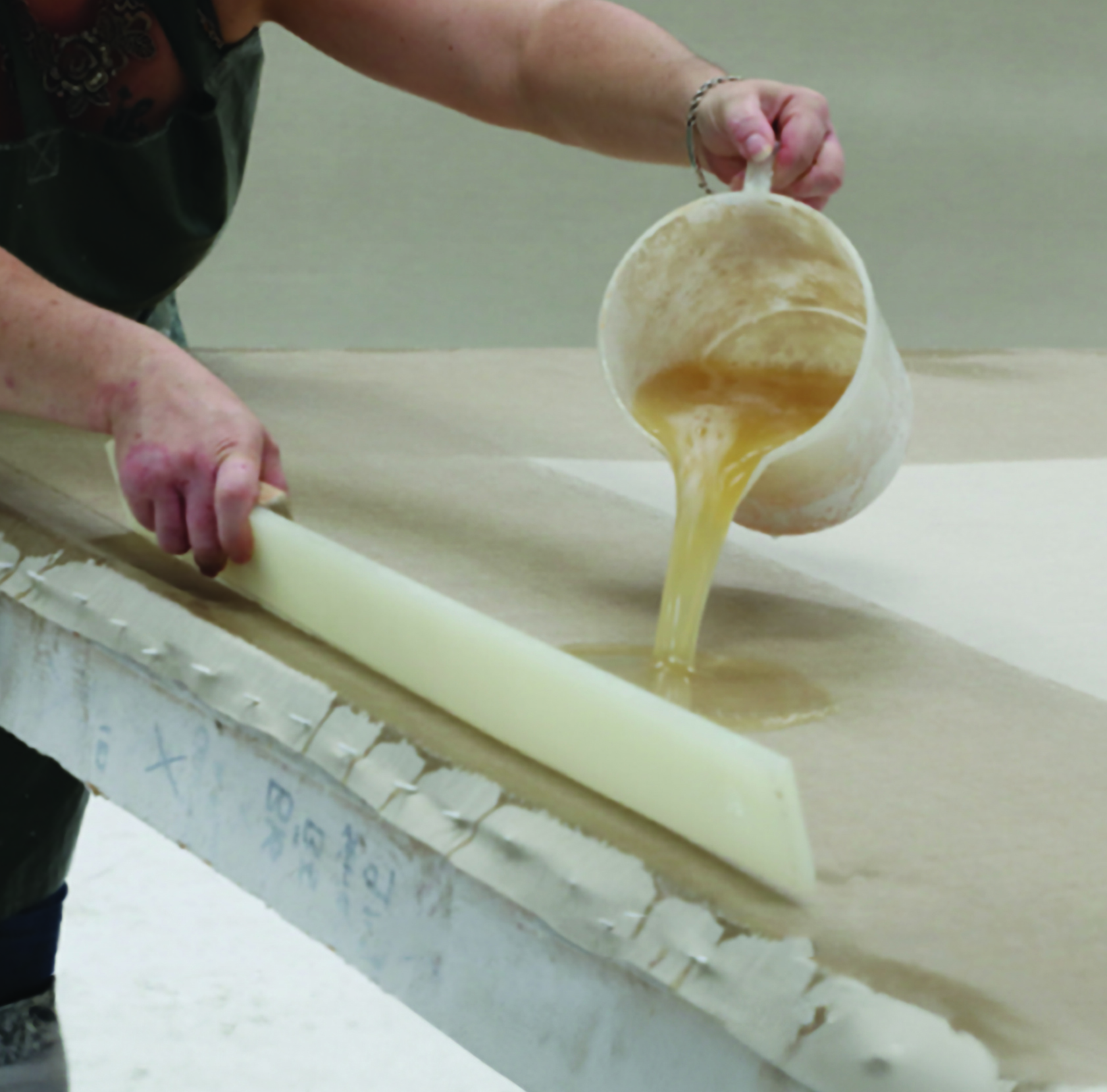 L'objectif ? Chasser l'air des interstices de la toile. Le geste précis au sabre permet d'écraser la colle à l'état de "gelée" tiède pour la faire pénétrer au cœur des fibres et boucher les pores du tissage. En raclant l'excédent avec la lame, on obtient une surface parfaitement plane, sans aucune bulle d'air visible à contre-jour.